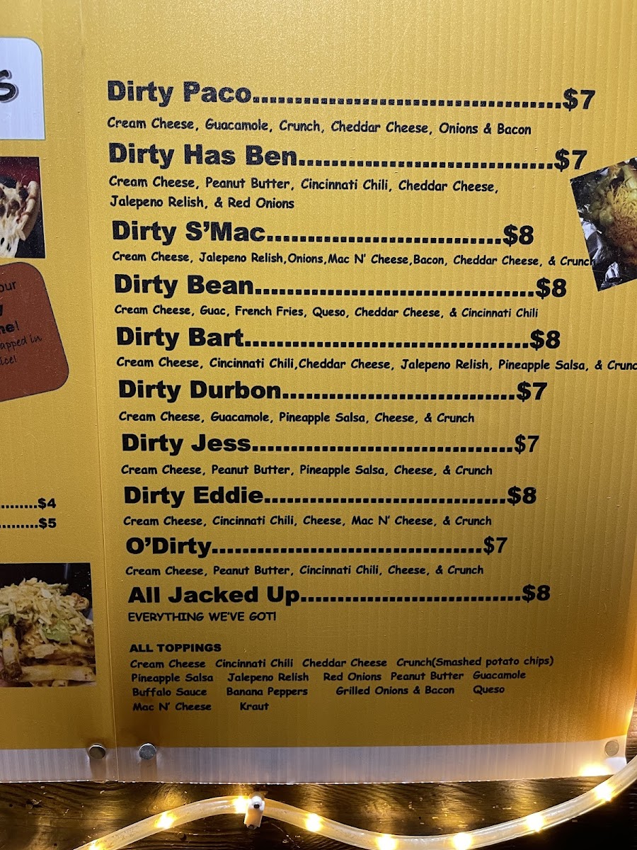 The All Beef Dogs are another highlight, offering hearty 1/4 lb options for those who love a good hot dog. Choices here include the Sube Dog, Dirty Harry, and Dirty Markes Marcus, all packed with bold flavors that will surely please any hot dog enthusiast. For those craving something more creamy, the Creamy Weene brings a unique twist, while the Dirty Curty adds a spicy, flavorful kick that makes it stand out on the menu.